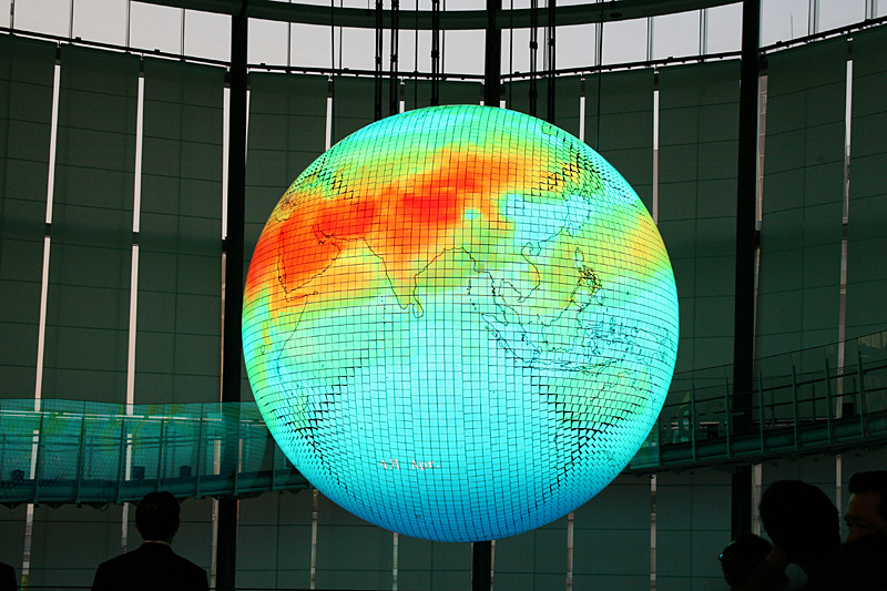 2010年10月から休止されていた日本科学未来館のシンボル展示「Geo-Cosmos(ジオ・コスモス)」が、有機ELの超高解像度版になって復活。豪華な来賓を招いて点灯式が開催されました。