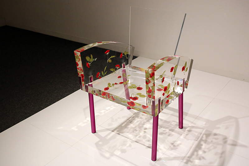 数々の名作椅子を所蔵し「椅子の美術館」としても知られる埼玉県立近代美術館。人気がある椅子のひとつが、赤い薔薇が浮かぶ透明なアクリルの椅子《ミス ブランチ》です。倉俣史朗(くらまたしろう)が1988年にデザインしました。