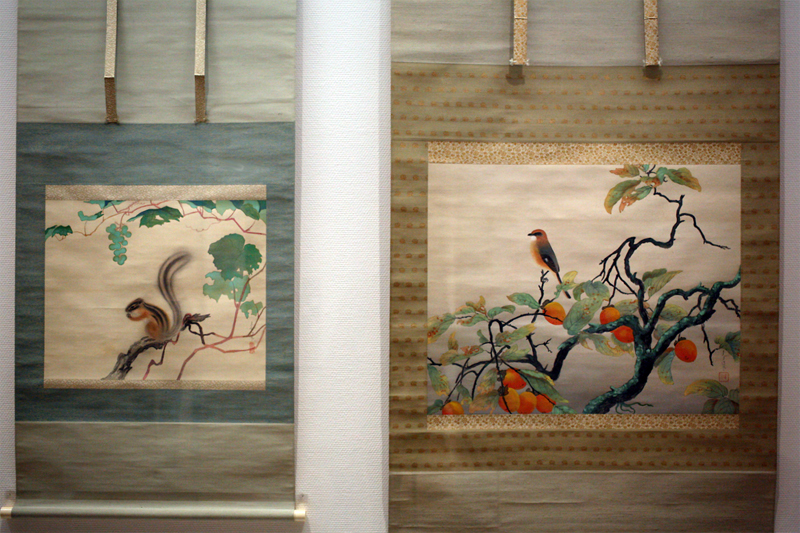 大野麥風 右《秋晴(もず)》/左《栗鼠》 絹本彩色 個人蔵