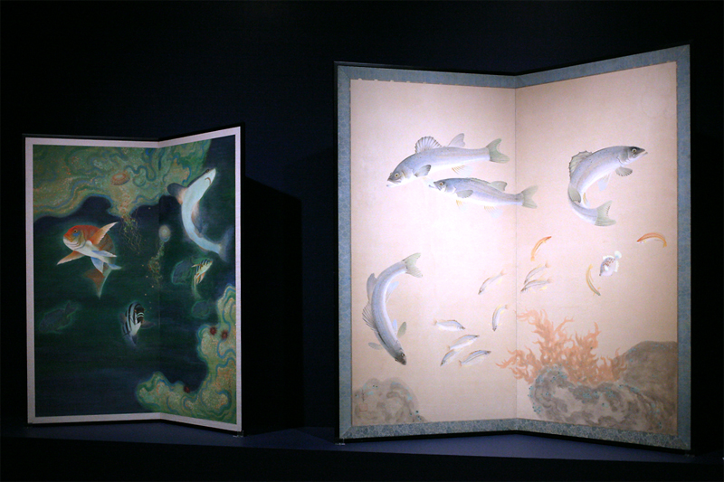 大野麥風 右《鱸群泳》 紙本彩色 二曲一隻/左《魚群海底》 紙本彩色 二曲一隻 個人蔵