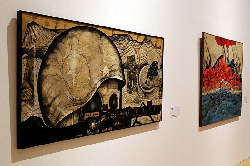 中村宏 (左)《基地》 1957年 油彩、合板 92 × 175 cm 所蔵:東京国立近代美術館 / (右)《聖火千里行》 1964年 油彩、キャンバス 130 × 162 cm 所蔵:高松市美術館、香川