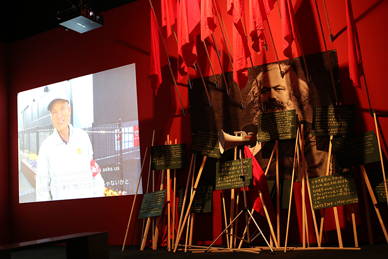 丹羽良徳 《日本共産党にカール・マルクスを掲げるように提案する》(部分) 2013年 2面マルチ・ビデオ・プロジェクション、大型拡声器、旗、垂れ幕、パネル 18分2秒 Courtesy: Ai Kowada Gallery, Tokyo