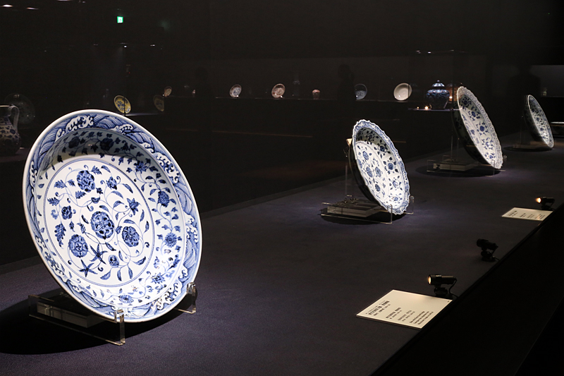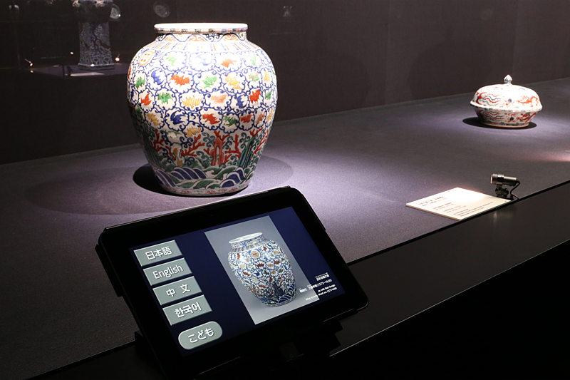 展示ケース脇の、タッチパネルPC年内いっぱいは、開館記念展「日本・東洋 美の遺産展」が開催中(2013年12月30日まで)。本稿では1階の「中国の陶磁・青銅器、韓国の陶磁」しか撮影できませんでしたが、むしろ見どころは2階から先です。3階には狩野派、長谷川派、琳派などの屏風。4階には若冲、与謝蕪村の軸物、歌麿や北斎の肉筆浮世絵、大観、春草、松園らの近代日本画までが並ぶ豪華な構成です。