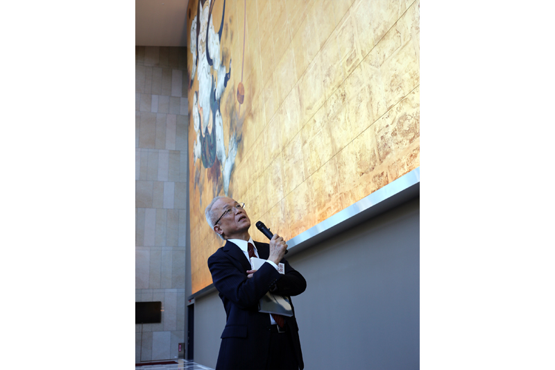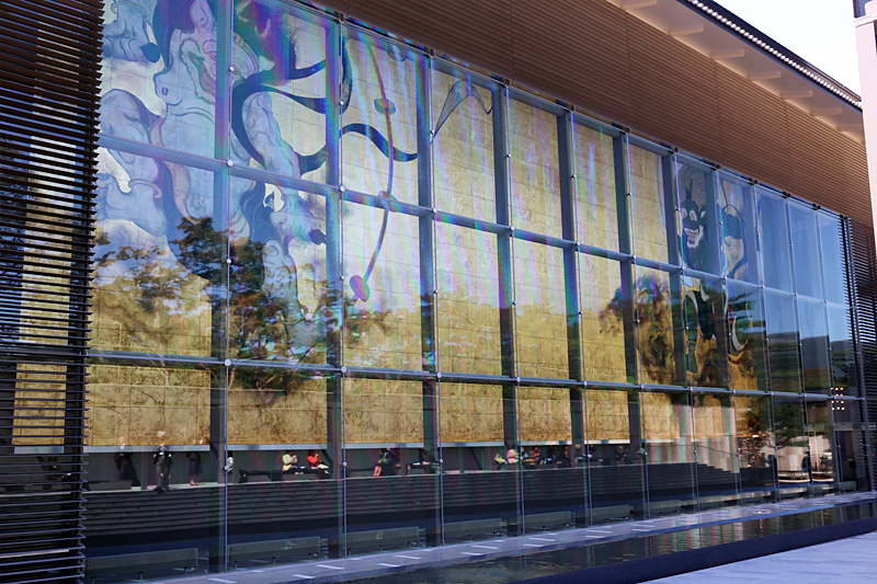 敷地に入ると、まず目に入るのは建物の外側から見える大きな風神と雷神。作品は現代日本画家の福井江太郎さんによる《風・刻》で、俵屋宗達の「風神雷神図屏風」をモチーフに、縦12m×横30mという巨大スケールで描きました。