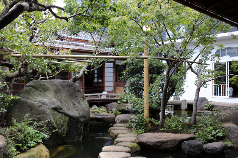 アトリエの奥に進むと、渡り廊下の左側には日本庭園「五典の水庭」が見えます。