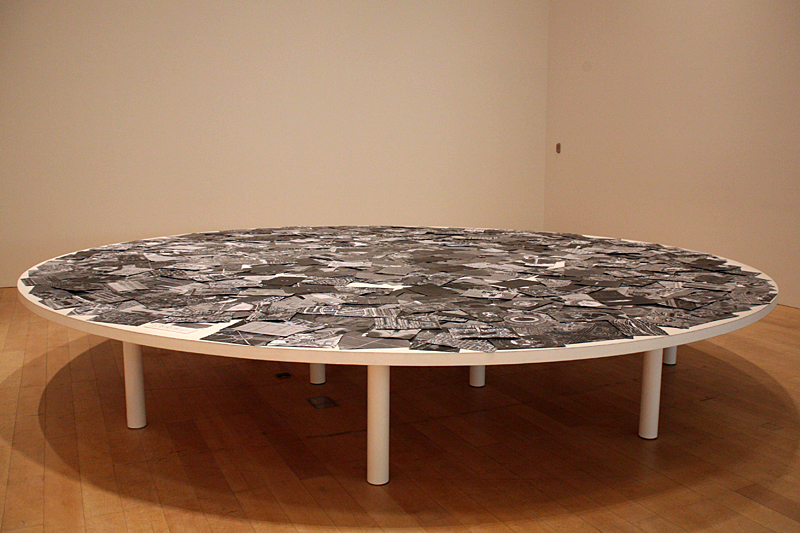 クロード・クロスキー《フラット・ワールド》2009年 Courtesy: Galerie Laurent Godin, Paris and Galerie Mehdi Chouakri, Berlin ◇テーブル上にばらまかれたモノクロ写真は、地球の反対側の航空写真が表裏にプリントされており、自由に手に取ってみることができます。