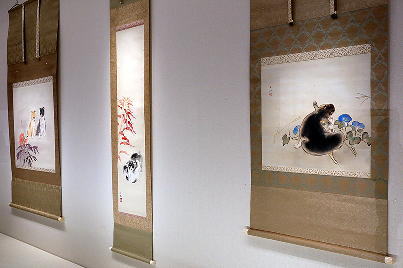 (右から)西村五雲《犬》 / 川﨑小虎《仔犬》 / 麻田辧自《薫風》 いずれも山種美術館