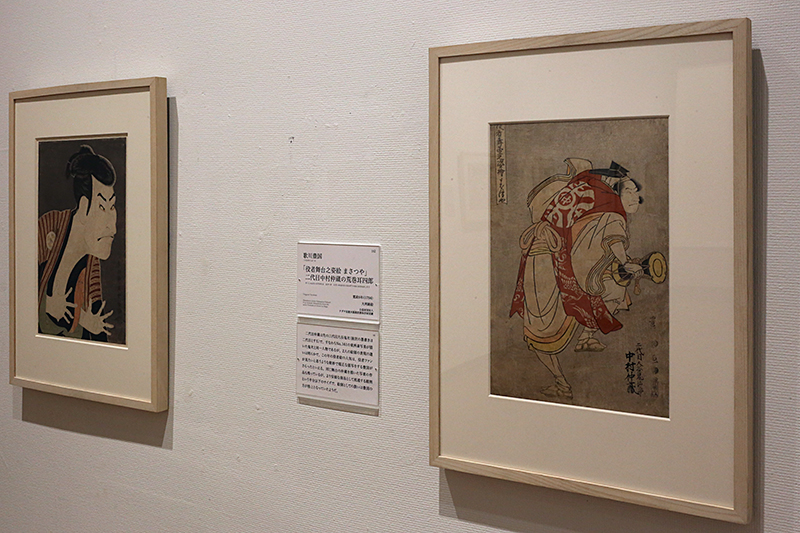 (右から)歌川豊国《「役者舞台之姿絵 まさつや」二代目中村仲蔵の荒巻耳四郎》 / 東洲斎写楽《三代目大谷鬼次の江戸兵衛》 ※同じ役者を描いていますが、その差は歴然としています
