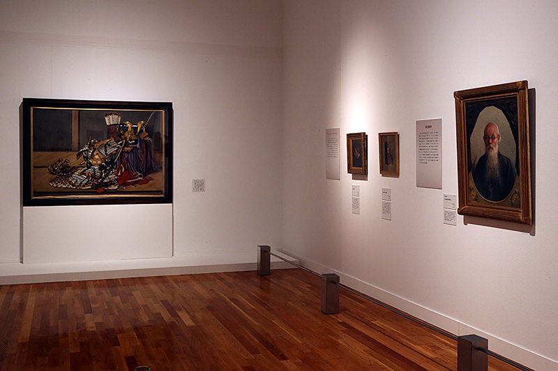 (左端)高橋由一《甲冑図(武具配列図)》 / (右端)渡辺幽香《五姓田芳柳像》