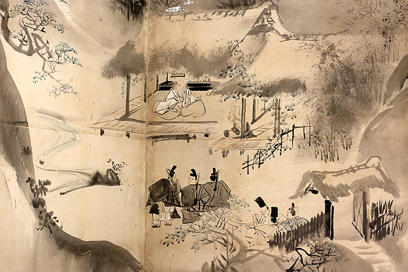 狩野尚信《富士見西行・大原御幸図屏風》(板橋区立美術館)安信は探幽の11歳下。狩野宗家の貞信(3兄弟の従兄)が若くして死去したため、養子となって宗家を継いだのは安信でした。