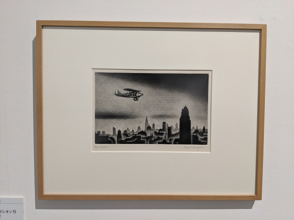 長谷川潔《摩天楼上空のポアン・ダンテロガシオン号〔ニューヨーク上空の〕》1930年 メゾチント