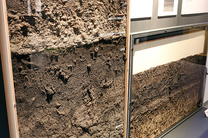 津波の堆積物が残る「地層剥ぎ取り標本」(産業技術総合研究所蔵(左)、仙台市教育委員会蔵(右))