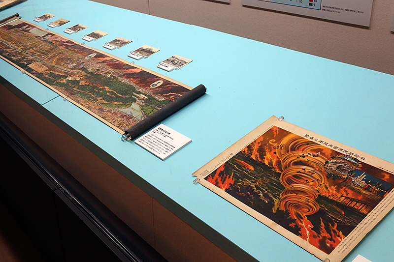 (右手前から)浦野銀次郎画「本所石原方面大旋風之真景(帝都大震災画報)」(国立歴史民俗博物館蔵) / 田畑勇吉・栗井三蔵合作「帝都震災記念大観」(国立歴史民俗博物館蔵)