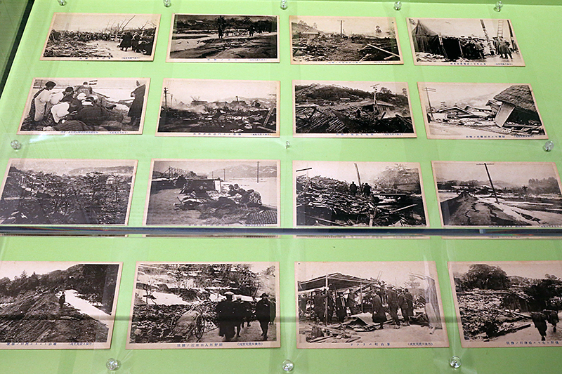 北丹後地震(1927年)の惨状を報じる絵葉書が並ぶ(京丹後市教育委員会蔵)