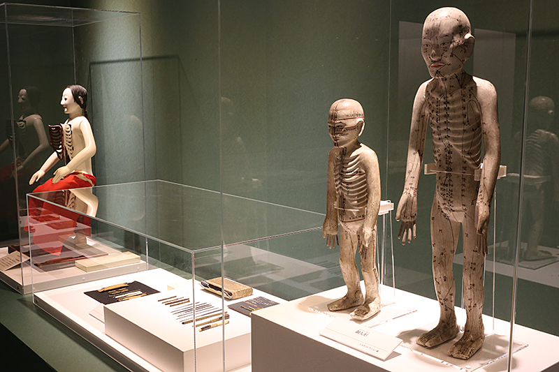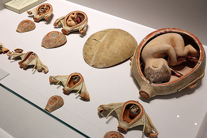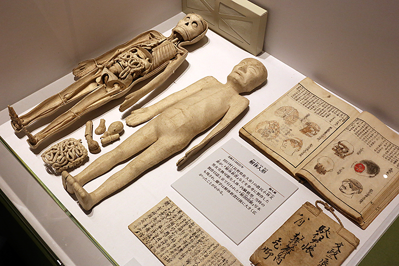 茶色の骨格標本は、木で作られた「奥田木骨」。「胎児模型」は、明治初期の産婆(助産婦)教育用です。現存する唯一の医学生き人形「五臓六腑生き人形」は、薬屋の看板や見世物に使われたと思われます。