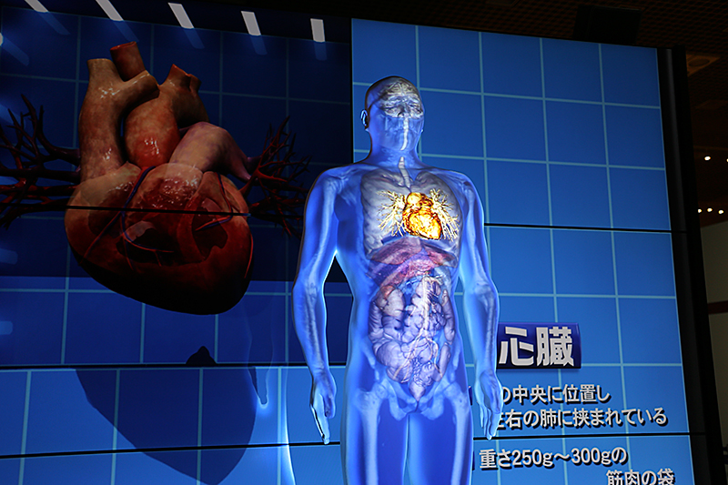 イベントで使われるプロジェクションマッピングは、外科手術や医療教育にも活用されています。展覧会ではその技術を応用、実在の人物のCTデータで作成した映像を等身大の模型にマッピングし、人体の仕組みを説明しています。