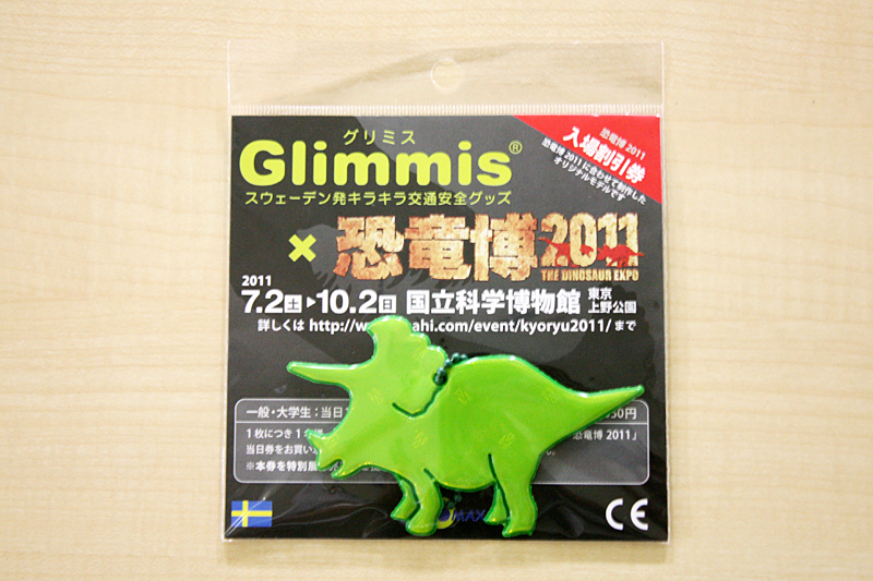 今回のオミヤゲは、恐竜博2011特製のグリミス(スウェーデン発の交通安全グッズで、おしゃれな反射板)。ティラノサウルスもありましたが、今回はトリケラトプスにしました。各630円。