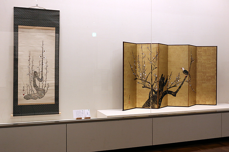 (左から)中村芳中《白梅図》 / 中村芳中《白梅小禽図屏風》