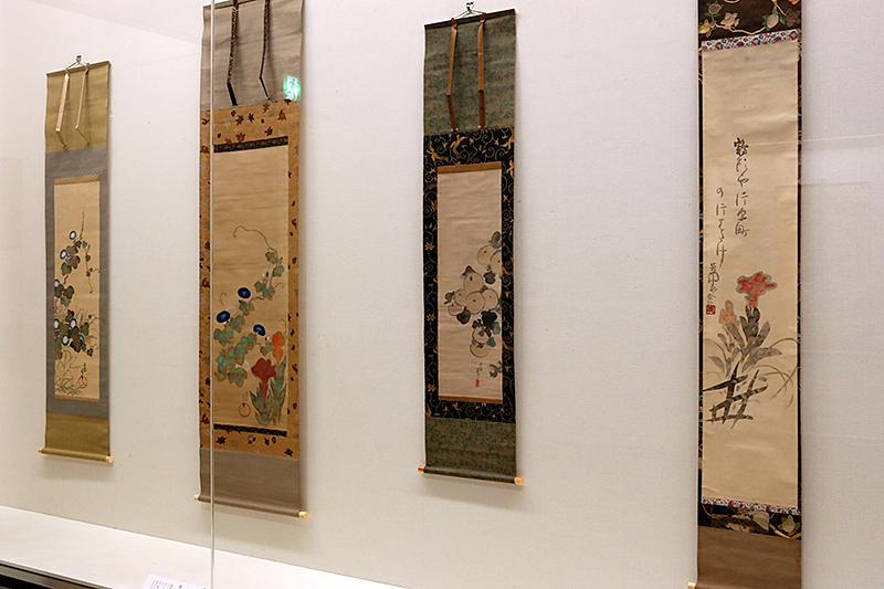 (右手前から)中村芳中《鶏頭図》 / 中村芳中《菊図》 / 中村芳中《鶏頭に朝顔図》 / 中村芳中《朝顔図》