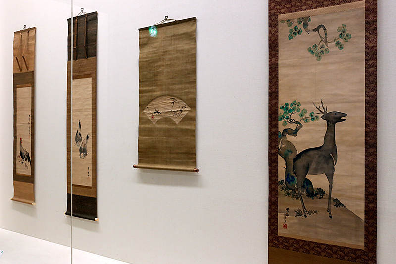 (右から)中村芳中《鹿図》 / 中村芳中《燕図扇面》 / 中村芳中《鳩図》 / 中村芳中《鶏図》