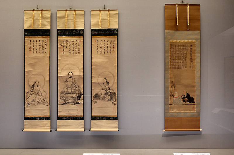 (左から)《釈迦・文殊・普賢像》海北友雪画・木庵賛 個人蔵 / 重要文化財《海北友松夫妻像》海北友雪画 個人蔵