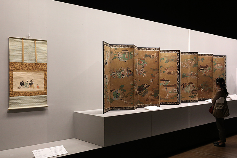 (奥)《徒然草図屏風》狩野寿信画 板橋区立美術館 / (手前)《徒然草絵巻》土佐光起画 個人蔵