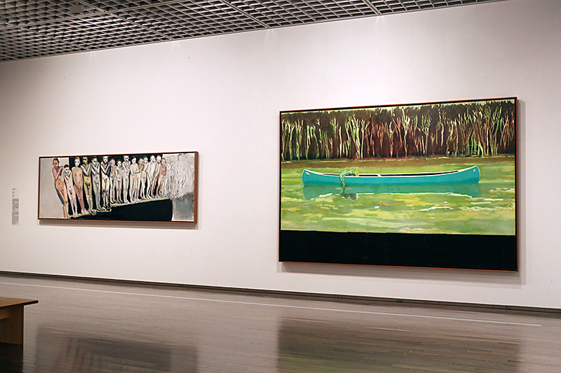 (左から)マルレーネ・デュマス《若い少年たち》1993年 / ピーター・ドイグ《カヌー・湖》1997年