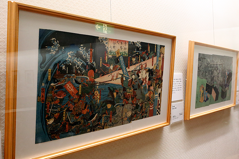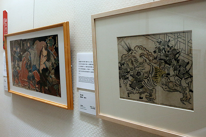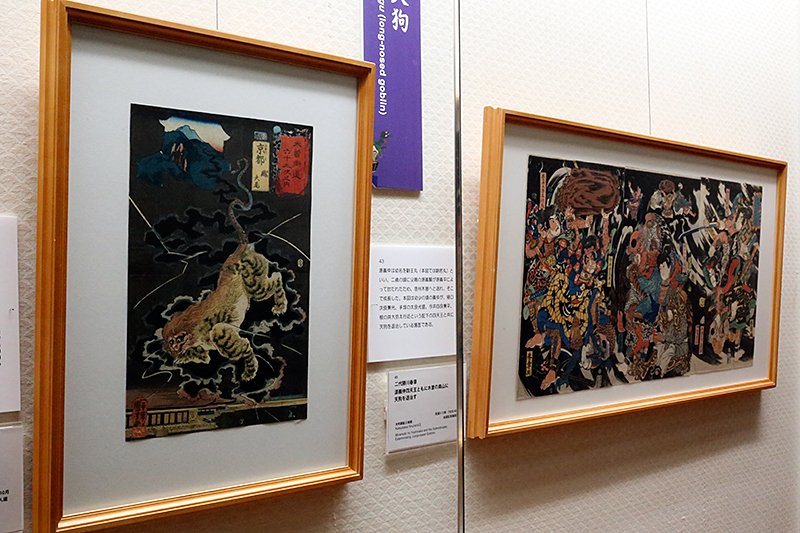 (左から)歌川国芳《木曽街道六十九次之内 京都 鵺 大尾》 / 二代勝川春章《源義仲四天王とともに木曽の奥山に天狗を退治す》
