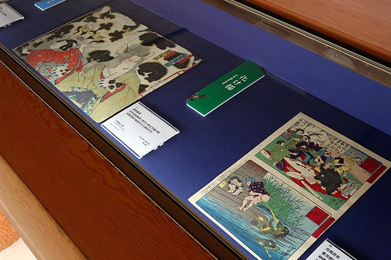 (右下)月岡芳年《東京開化狂画名所 柳橋書画会画工の狼藉》《深川木場川童臭気に辟易》 / (左上)豊原国周《五代目坂東彦三郎の小笹之方猫の精 坂東団弥の由留木の公達友千代》
