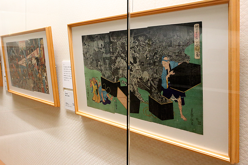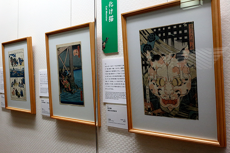 (右から)歌川芳藤《五拾三次之内猫之怪》 / 歌川広景《江戸名所道戯尽 二 両国の夕立》 / 歌川芳盛《しん板かつぱの道化》