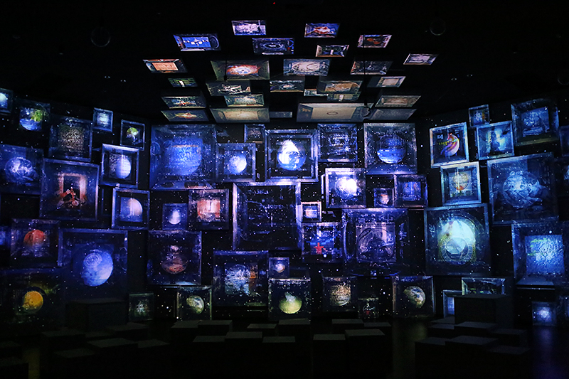 「はじまりの部屋」続く「シアター宙(ソラ)」は、施設の目玉といえるエリア。直径11mの円形スクリーンを観客が囲んで覗き込むという、独特のスタイルです。