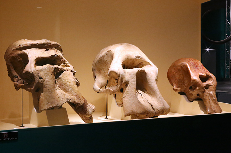 左からナウマンゾウの頭骨、アフリガゾウの頭骨、ケナガマンモスの頭骨