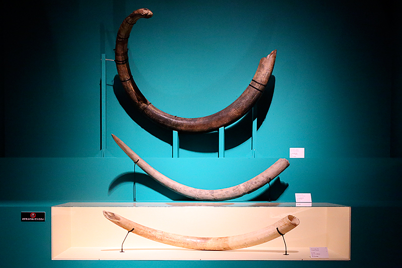 上からケナガマンモスの牙、ナウマンゾウの牙、アフリガゾウの牙
