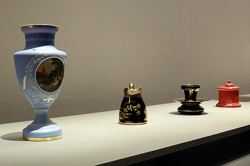 (左から)《風俗画文花瓶》 / 《シノワズリー文ミルクピッチャー》 / 《口すすぎ碗(ムントベッヒャー)》 / 《蓋付箱》