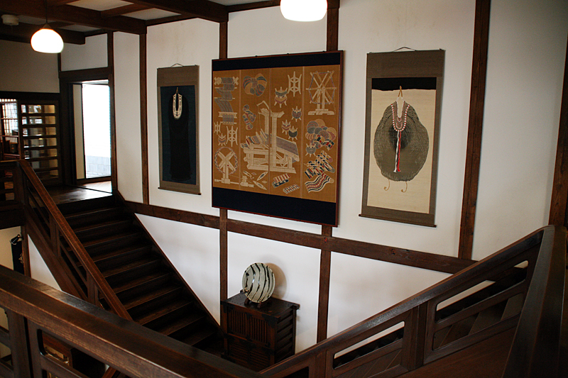 吹き抜け部にあしらわれた、芹沢銈介の作品3点。中央の焼き物は、濱田庄司による大鉢。