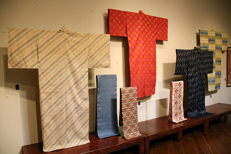 柳悦孝による着物や帯地など。左手前は「三色手綱絣 着物」(1979年)。粋な柄です。
