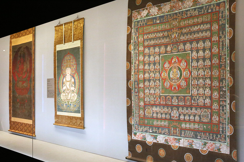 (左から)重要文化財《天弓愛染明王像》(展示は10/11~11/3) / 重要文化財《大日如来像》(展示は10/11~11/3) / 《両界曼荼羅図のうち胎蔵界》(展示は10/11~11/10)
