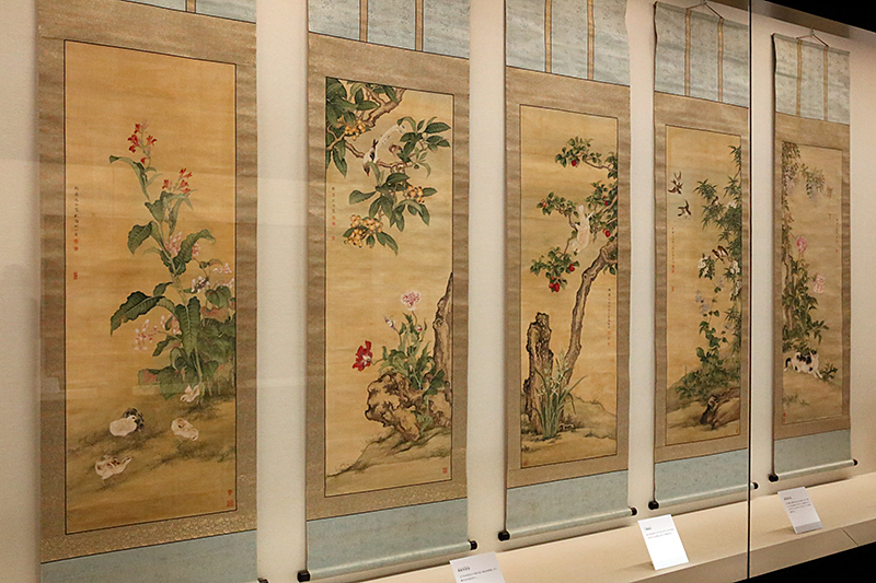 《花鳥動物図》沈南蘋 11幅の内、左から檀特鶏鶵図・枇杷寿帯図・白鸚鵡図・群鳥倚竹図・藤花独猫図