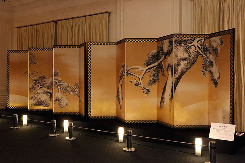 高精細デジタルデータを大判インクジェットプリンターで特製の和紙に印刷し、京都の伝統工芸師が金泥加工を施した「雪松図屏風」。実物では難しい方法でも展示できるのが強みで、過去にはロウソクの灯りで観せた事もあります。