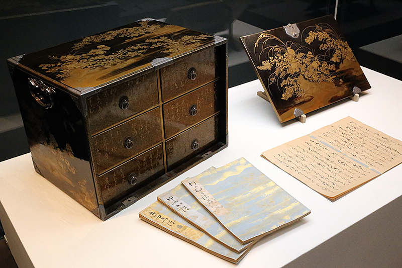 最後の展示室には、まさに「雪月花」と名付けられた《唐物竹組大茶籠(雪月花)》も。小さな茶道具と香道具40余点が竹籠に入ったセットで、北三井家8代の高福(たかよし)が仕立てました。箱書きに「月雪も花も友とて茶箱かな」とあります。