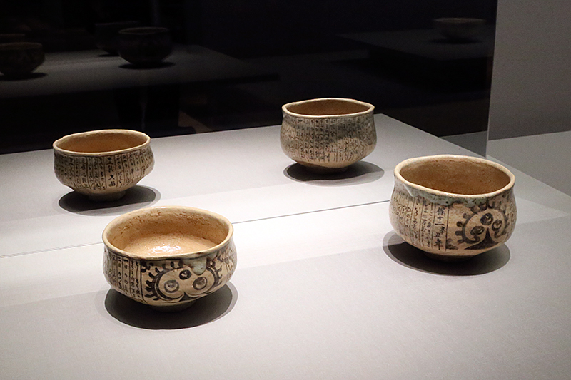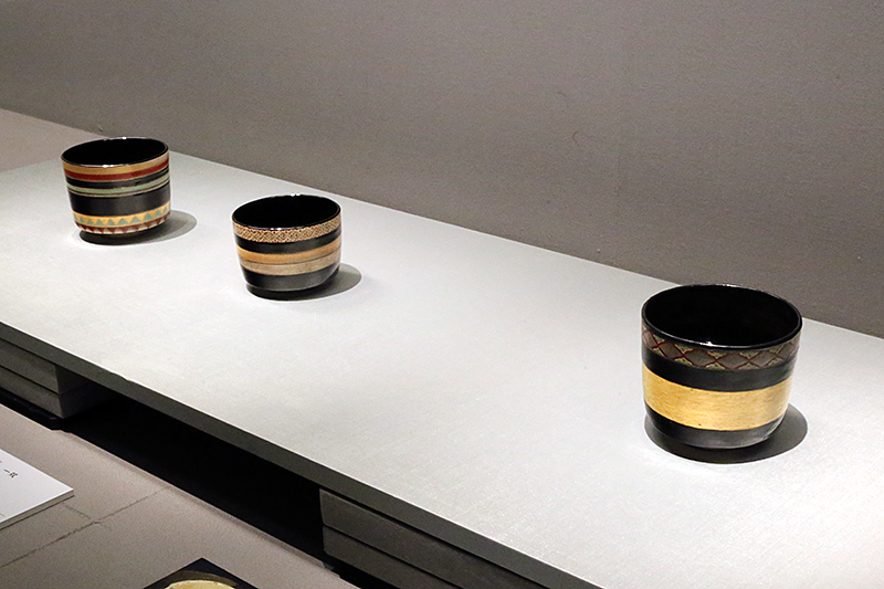 (左から)仁阿弥道八《色絵筋文入子茶碗 一双》逸翁美術館蔵 / 野々村仁清《金筋隠印茶碗》野村美術館蔵