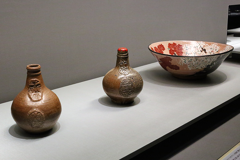 (左から)讃窯《褐釉人面貼付文徳利》東京国立博物館蔵(小倉安之氏寄贈) / ドイツ・フレッヒェン《塩釉髭徳利》京都国立博物館蔵 / 仁阿弥道 讃窯《色絵桜楓文鉢》京都国立博物館蔵
