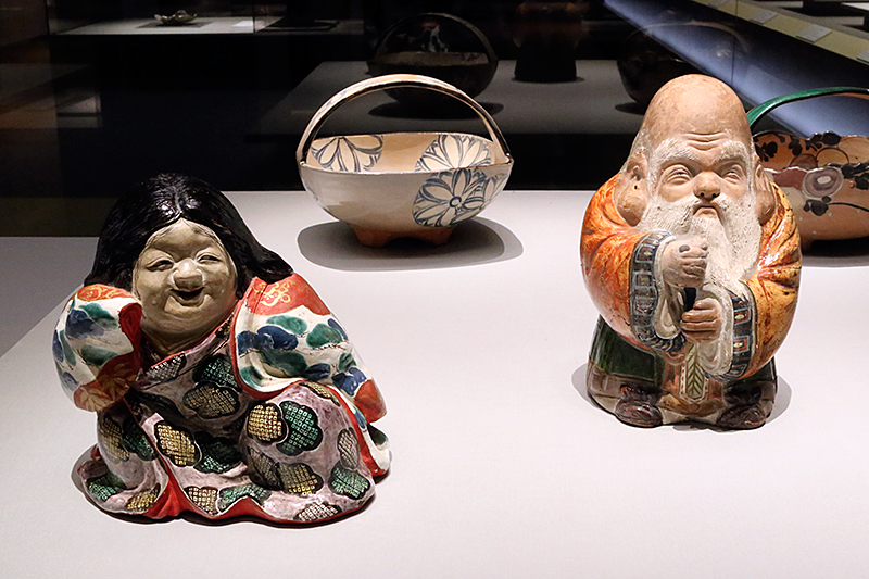 (左から)3点とも仁阿弥道八 《色絵宇須女置物》高津古文化会館蔵 / 《銹絵染付菊文手鉢》個人蔵 / 《色絵寿星立像》高津古文化会館蔵 / 三代高橋道八 讃窯《色絵菊文手鉢》東京国立博物館蔵(小倉安之氏寄贈)