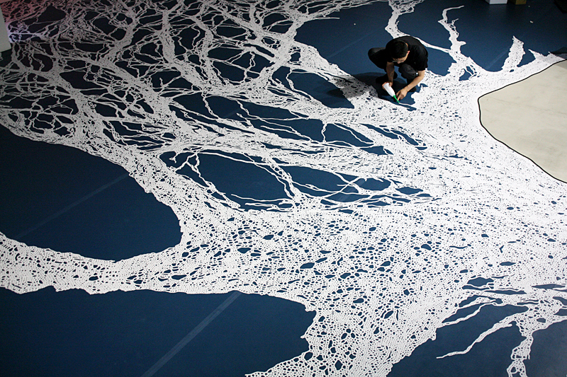 木の枝や血管、進化の過程を表す図のような作品が、2階の公開制作作品「常世の杜(とこよのもり)」です。目には見えなくとも、確かに繋がっている命を表現した作品。動画でご覧いただいて分かるように、精製塩を油差しのボトルに入れ、一人で黙々と制作していきます。制作時間は1日約12時間、今回は12日かけて作り上げます。