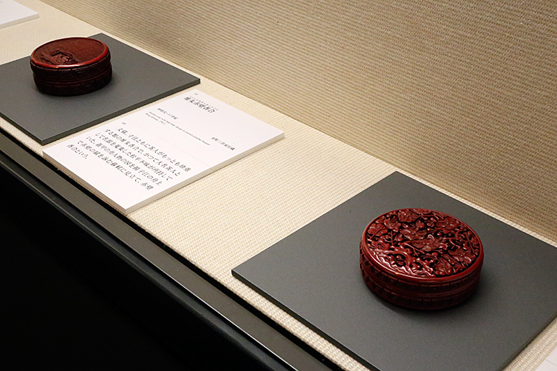 (左奥から)《堆朱赤壁香合》 / 《堆朱梅香合》