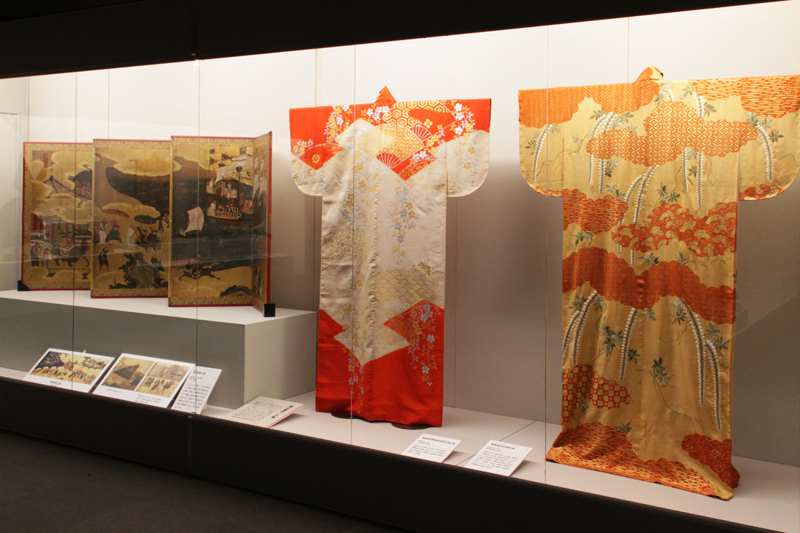 左から)南蛮屏風 六曲一双 17世紀初期 愛知・西蓮寺蔵、肩裾松皮菱扇面枝垂桜文様小袖、雲取藤花文様打掛 着物はいずれも昭和8年復元 京都染織文化協会蔵