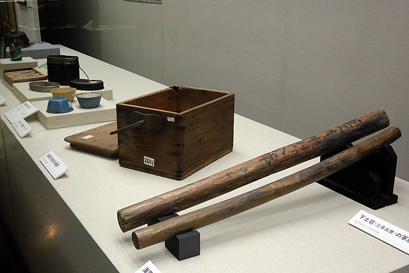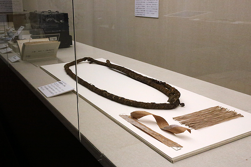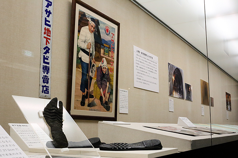 「地下壕内採集の地下足袋の靴底ゴム」と、当時圧倒的シェアを誇っていた「アサヒ地下足袋」の関連資料