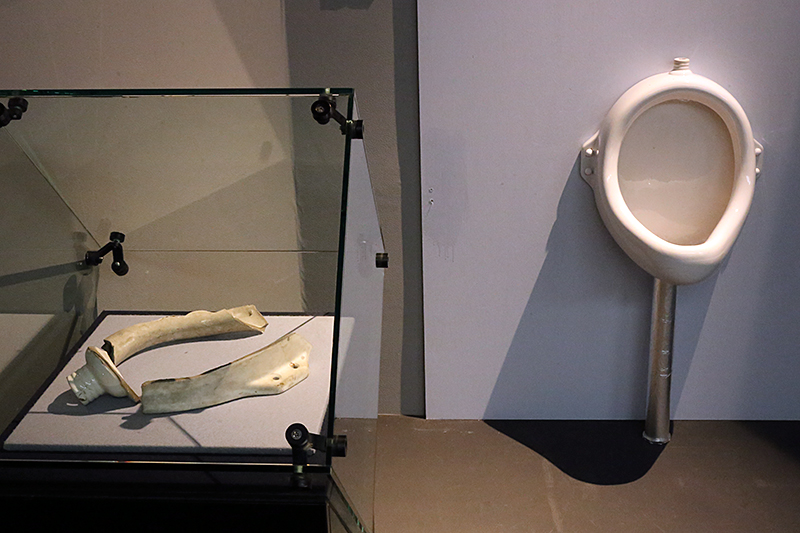 「地下壕内採集の小便器破片」と、同型の小便器(東洋陶器 U-5)