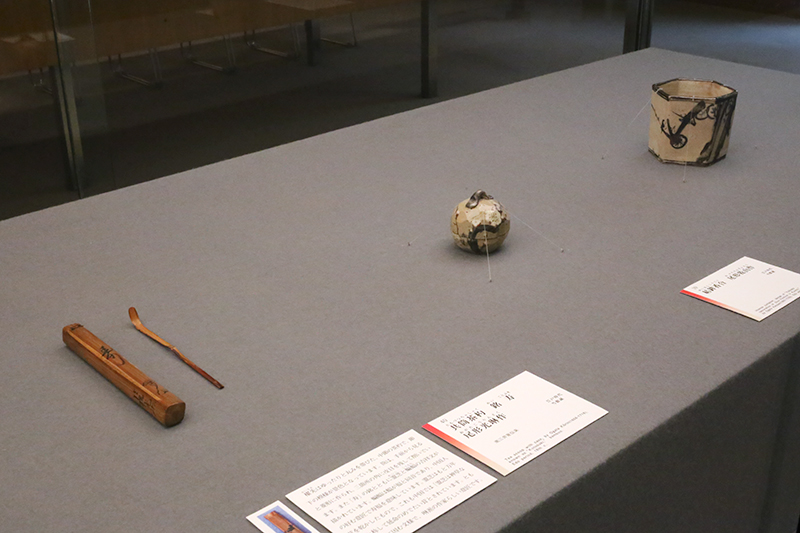(左手前から)《共筒茶杓 銘 寿》尾形光琳作 / 《結鉾香合》尾形乾山作 / 《銹絵染付火入 銘 赫々》尾形乾山作・尾形光琳絵