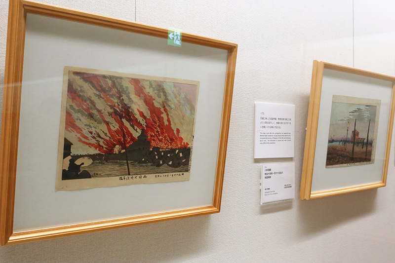 (左から)小林清親《明治十四年一月廿六日出火 両国大火浅草橋》 / 小林清親《明治十四年一月十六日出火 両国焼跡》